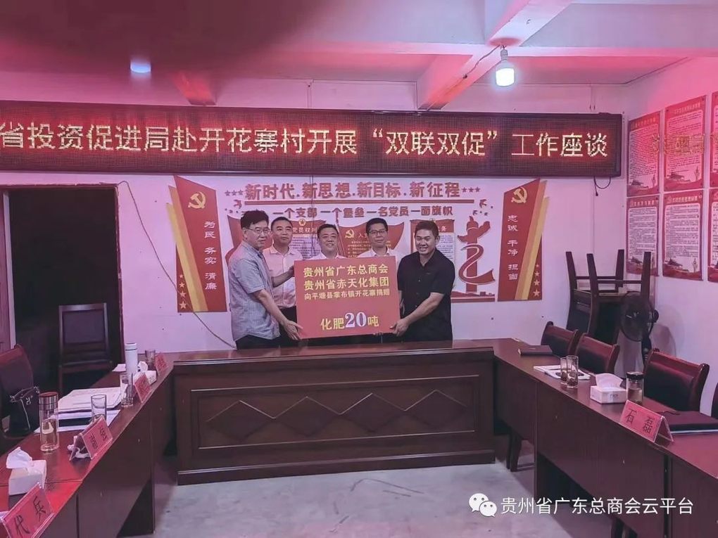 为有效了解乡村振兴和巩固脱贫攻坚成果,6月29日,应贵州省投资促进局安排,我商会秘书长金飞及秘书处工作人员王兰美随省投资促进局党组书记代兵、局长谢强、副局长付应刚、机关党委副书记陈衍竺赴平塘县掌布镇开花寨村考察调研并参加了乡村振兴结对帮扶交流座谈会,主要是为进一步巩固拓展脱贫攻坚成果同乡村全面振兴有效衔接。平塘县委副书记、县长石磊、掌布镇党委书记石国垚、开花寨村驻村第一书记张澍韬、村党支部书记冷世才等班子成员参加了会议。会后,贵州省赤天化集团向开花寨村捐赠化肥20吨,用实际行动助力乡村发展。