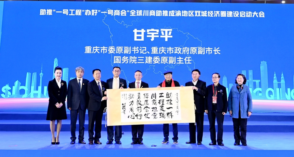 大会上,重庆市委原副书记、重庆市政府原副市长、国务院三建委原副主任甘宇平为商会送上亲自手书的书法作品,表达他对商会发展深深的祝福。重庆市人大原副主任、重庆市关心下一代工作委员会常务副主任唐情林,重庆市政协原副主席、重庆大学教授 陈万志,重庆市政府原副秘书长高沙飞上台共同见证。